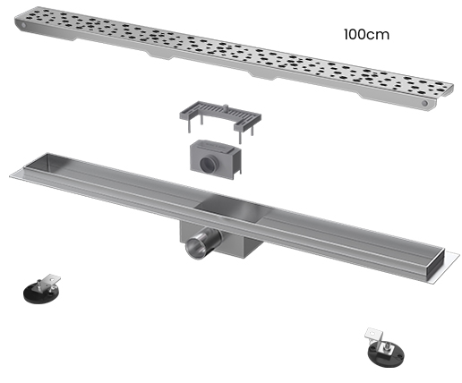 Bestehend aus Duschrinnenkorpus in Edelstahmit verstellbaren FuBenEdelstahlabdeckung in verschDekoren -Geruchsverschluss Dichtvlies -Abflussadapter -Haarsieb Haken zur Abdeckungsentnahme